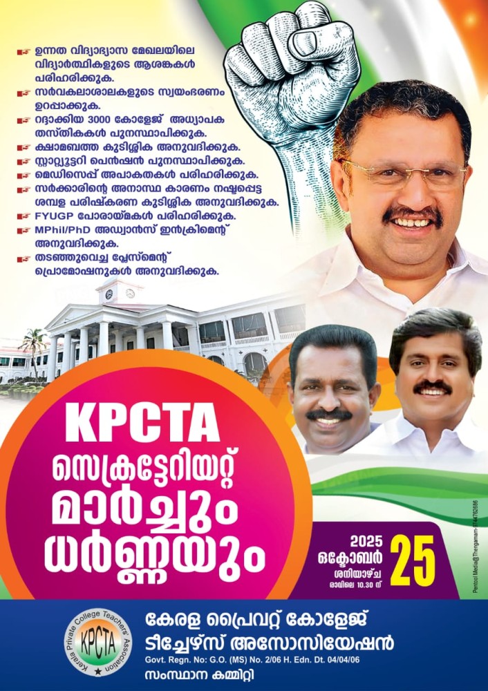 കേരളത്തിലെ മുഴുവൻ കോളേജുകളിലും ഉള്ള അധ്യാപകരുടെ ആനുകൂല്യങ്ങൾ ഒന്നൊന്നായി സർക്കാർ കവർന്നെടുക്കുകയാണെന്നും അതുവഴി ഉന്നത വിദ്യാഭ്യാസ രംഗത്തെ തകർക്കുകയാണെന്നും അതിനെതിരെ പ്രതിഷേധിച്ചു കൊണ്ട് കേരള പ്രൈവറ്റ് കോളേജ് ടീച്ചേർസ് അസോസിയേഷൻ കെ പി സി ടി എ ) കരിദിനം ആചരിച്ചു. കേരളത്തിലെ എയ്ഡഡ് കോളേജുകളിലെ അധ്യാപകർ കേരളത്തിലെ മുഴുവൻ കോളേജുകളിലും നടത്തിയ പ്രതിഷേധത്തിൽ സർക്കാരിന്റെ അധ്യാപക വിരുദ്ധ നിലപാടികൾക്കെതിരെ പ്രതിഷേധിച്ചു. കേന്ദ്ര നിയമങ്ങൾക്കും സംസ്ഥാന നിയമങ്ങൾക്കും മുകളിലുള്ള യൂണിവേഴ്സിറ്റി ഗ്രാന്റ്സ് കമ്മീഷൻ 2018 റെഗുലേഷൻ മുഖേന അനുവദിച്ച അഡ്വാൻസ് ഇൻക്രെമെന്റ് കേന്ദ്ര സർക്കാരിന്റെ ചില കത്തുകൾ ചൂണ്ടിക്കാണിച്ചു കൊണ്ട് കോളേജ് അധ്യാപകർക്ക് നിഷേധിക്കുന്ന സർക്കാർ ഉന്നത വിദ്യാഭ്യാസ രംഗത്ത് പ്രവർത്തിക്കുന്നവരോട് കണ്ണിൽ ചോരയില്ലാത്ത ക്രൂരതയാണ് കാണിക്കുന്നതെന്ന് കെ പി സി ടി എ ഭാരവാഹികൾ പറഞ്ഞു. എട്ടാം ശമ്പള പരിഷ്കരണം 2026 ൽ കേന്ദ്ര സർക്കാർ കൊണ്ട് വരുമ്പോൾ യൂ ജി സി അധ്യാപകർക്കും ലഭ്യമാകും. എന്നാൽ നിലവിലെ 2016 - 2019 കാലഘട്ടത്തിലെ ശമ്പള കുടിശ്ശികയും മറ്റു കുടിശ്ശികകളും അധ്യാപകർക്ക് സർക്കാർ ഇതുവരെ കൊടുക്കാതെ 2026 ൽ വരുന്ന ശമ്പളപരിഷ്കരണം തടസ്സപ്പെടുത്താനാണ് സർക്കാർ ശ്രമിക്കുന്നത് എന്ന് കെ പി സി ടി എ കുറ്റപ്പെടുത്തി. ഉന്നതവിദ്യാഭ്യാസ രംഗത്തെ തകർക്കുന്ന നയങ്ങളിൽ നിന്നും സർക്കാർ പിന്മാറണമെന്നും അധ്യാപകർക്ക് അർഹമായ ആനുകൂല്യങ്ങളും കുടിശ്ശികകളും ഉടൻ നൽകണമെന്നും അവകാശങ്ങൾ നിഷേധിക്കുന്ന ഉത്തരവുകൾ പിൻവലിക്കണമെന്നും കെ പി സി ടി എ ആവശ്യപ്പെട്ടു.