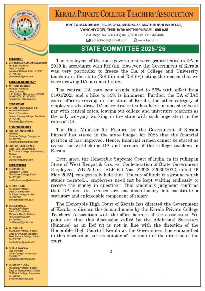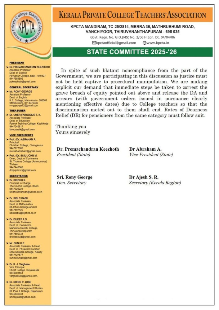 ബഹു. കേരള ഹൈക്കോടതിയിൽ KPCTA ഫയൽ ചെയ്ത WPC No. 27618/2023 (B) DA കേസിലെ ഇടക്കാല വിധിയുടെ അടിസ്ഥാനത്തിൽ 30/07/2025, 3PM ന് സെക്രട്ടറിയേറ്റ് അനക്സ് 1, റൂം നമ്പർ 606 ൽ ധനകാര്യ അഡീഷണൽ സെക്രട്ടറി യുടെ ചേംബറിൽ നടന്ന ചർച്ചയിൽ, കോളേജ് അധ്യാപകർക്ക് ലഭിക്കേണ്ട അർഹമായ ക്ഷാമബത്തയും കുടിശ്ശികയും ഉടൻ ലഭ്യമാക്കണമെന്നും, പേ റിവിഷൻ അരിയർ ഉടൻ വിതരണം ചെയ്യണമെന്നും KPCTA ആവശ്യപ്പെട്ടു. ചർച്ചക്ക് ശേഷം ഇത് സംബന്ധിച്ച് KPCTA നിവേദനം നൽകി. KPCTA യെ പ്രതിനിധീകരിച്ച് സംസ്ഥാന വൈസ് പ്രസിഡൻ്റ് ഡോ. എബ്രഹാം എ, സംസ്ഥാന ജനറൽ സെക്രട്ടറി റോണി ജോർജ്, കേരള മേഖല സെക്രട്ടറി ഡോ. അജേഷ് എസ്. ആർ എന്നിവർ പങ്കെടുത്തു.