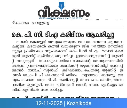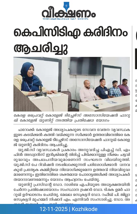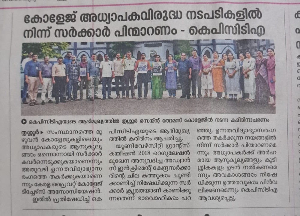 കേരളത്തിലെ മുഴുവൻ കോളേജുകളിലും ഉള്ള അധ്യാപകരുടെ ആനുകൂല്യങ്ങൾ ഒന്നൊന്നായി സർക്കാർ കവർന്നെടുക്കുകയാണെന്നും അതുവഴി ഉന്നത വിദ്യാഭ്യാസ രംഗത്തെ തകർക്കുകയാണെന്നും അതിനെതിരെ പ്രതിഷേധിച്ചു കൊണ്ട് കേരള പ്രൈവറ്റ് കോളേജ് ടീച്ചേർസ് അസോസിയേഷൻ കെ പി സി ടി എ ) കരിദിനം ആചരിച്ചു. കേരളത്തിലെ എയ്ഡഡ് കോളേജുകളിലെ അധ്യാപകർ കേരളത്തിലെ മുഴുവൻ കോളേജുകളിലും നടത്തിയ പ്രതിഷേധത്തിൽ സർക്കാരിന്റെ അധ്യാപക വിരുദ്ധ നിലപാടികൾക്കെതിരെ പ്രതിഷേധിച്ചു. കേന്ദ്ര നിയമങ്ങൾക്കും സംസ്ഥാന നിയമങ്ങൾക്കും മുകളിലുള്ള യൂണിവേഴ്സിറ്റി ഗ്രാന്റ്സ് കമ്മീഷൻ 2018 റെഗുലേഷൻ മുഖേന അനുവദിച്ച അഡ്വാൻസ് ഇൻക്രെമെന്റ് കേന്ദ്ര സർക്കാരിന്റെ ചില കത്തുകൾ ചൂണ്ടിക്കാണിച്ചു കൊണ്ട് കോളേജ് അധ്യാപകർക്ക് നിഷേധിക്കുന്ന സർക്കാർ ഉന്നത വിദ്യാഭ്യാസ രംഗത്ത് പ്രവർത്തിക്കുന്നവരോട് കണ്ണിൽ ചോരയില്ലാത്ത ക്രൂരതയാണ് കാണിക്കുന്നതെന്ന് കെ പി സി ടി എ ഭാരവാഹികൾ പറഞ്ഞു. എട്ടാം ശമ്പള പരിഷ്കരണം 2026 ൽ കേന്ദ്ര സർക്കാർ കൊണ്ട് വരുമ്പോൾ യൂ ജി സി അധ്യാപകർക്കും ലഭ്യമാകും. എന്നാൽ നിലവിലെ 2016 - 2019 കാലഘട്ടത്തിലെ ശമ്പള കുടിശ്ശികയും മറ്റു കുടിശ്ശികകളും അധ്യാപകർക്ക് സർക്കാർ ഇതുവരെ കൊടുക്കാതെ 2026 ൽ വരുന്ന ശമ്പളപരിഷ്കരണം തടസ്സപ്പെടുത്താനാണ് സർക്കാർ ശ്രമിക്കുന്നത് എന്ന് കെ പി സി ടി എ കുറ്റപ്പെടുത്തി. ഉന്നതവിദ്യാഭ്യാസ രംഗത്തെ തകർക്കുന്ന നയങ്ങളിൽ നിന്നും സർക്കാർ പിന്മാറണമെന്നും അധ്യാപകർക്ക് അർഹമായ ആനുകൂല്യങ്ങളും കുടിശ്ശികകളും ഉടൻ നൽകണമെന്നും അവകാശങ്ങൾ നിഷേധിക്കുന്ന ഉത്തരവുകൾ പിൻവലിക്കണമെന്നും കെ പി സി ടി എ ആവശ്യപ്പെട്ടു.